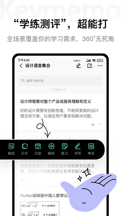 Keymemo app是一款支持在手机上使用的记忆卡软件,用户能够通过这里去创建学习记忆卡,利用日常的零碎时间轻松学习记忆,随时随地学习,支持生成学习卡、测试卡、音频、巩固练习卡等7种学习模式,360°解决大家的记忆问题。