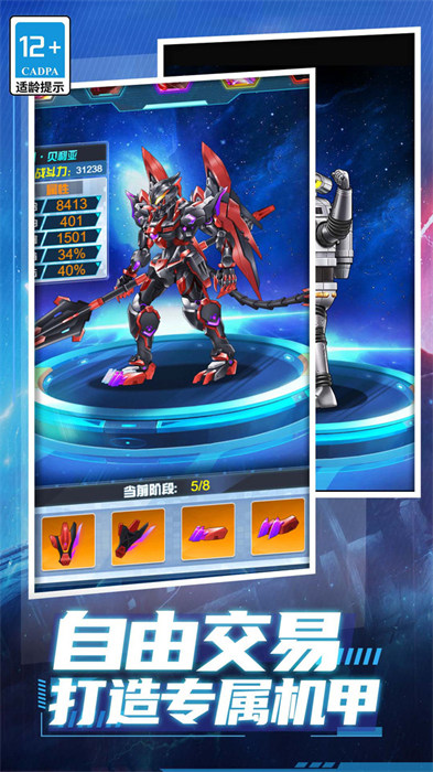 2、多种机甲等你选择,每个机甲都有专属的炫酷装扮以及强大的技能;