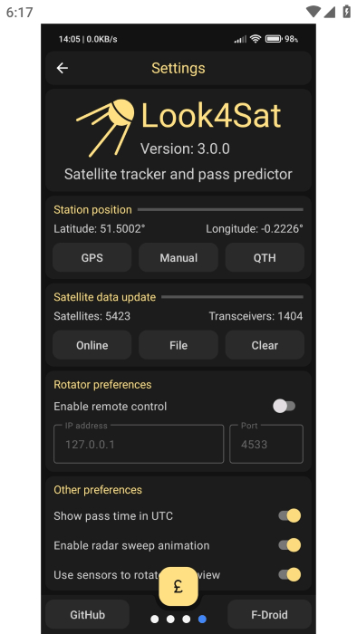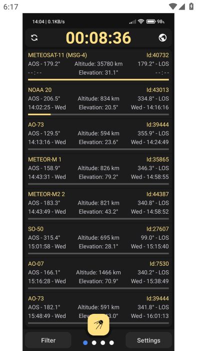 look4sat汉化版是一款可帮我们轻松定位和追踪各类卫星的应用程序,在这里可通过实时地图显示,准确地查看卫星的位置和轨迹,还能实时获得卫星过境时间和方位角等详细信息,非常适合喜爱观测卫星的爱好者和科研人员使用。
