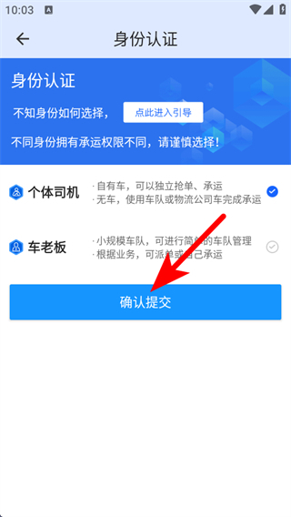 2、在身份认证页面,选择身份后点击确认提交,完成身份选择。