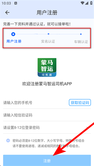 3、在页面填写手机号等信息后,点击注册,后续根据提示完成流程。