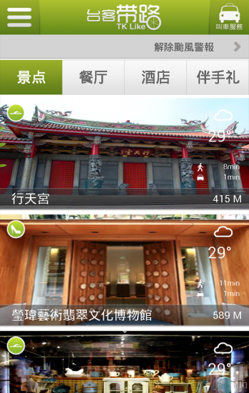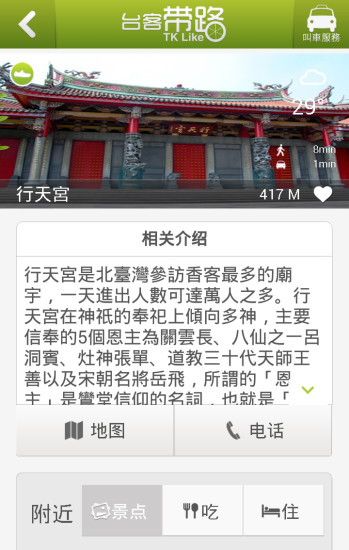 台客带路是一款专门为旅行人士设计的出行必备app,当你到达台湾时,人生地不熟,使用此app你将一键查询周边景点、周边美食、导航功能、叫车服务等特色功能,让你的出行变得更加精彩,欢迎下载!