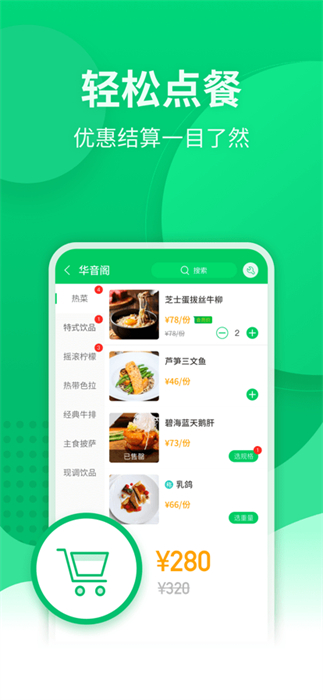 1、快速点餐:能够通过软件快速浏览当前餐厅的菜单,从而快速进行线上点单;