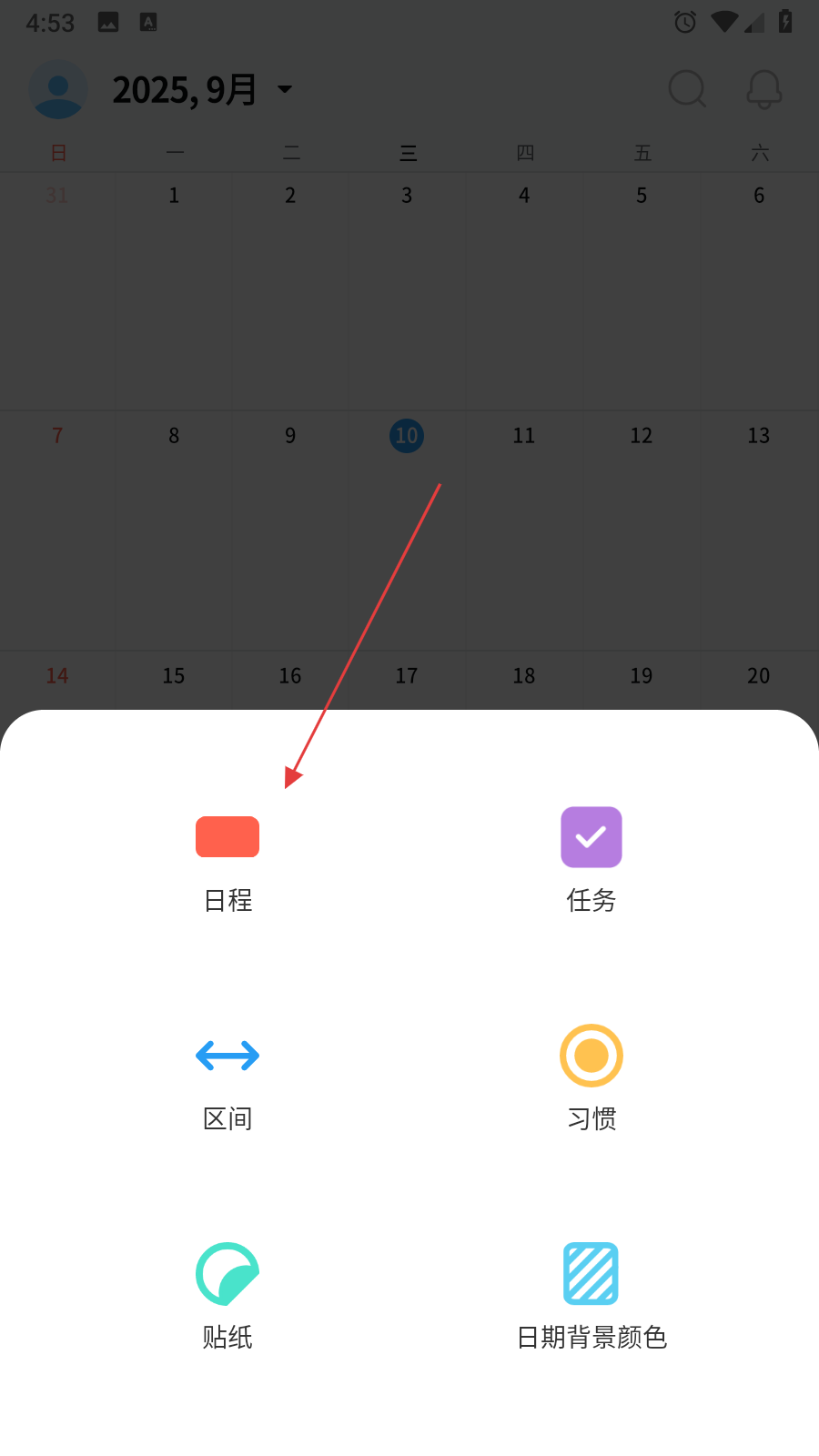 2、在弹出的功能选项里,点击日程,进入日程编辑界面。