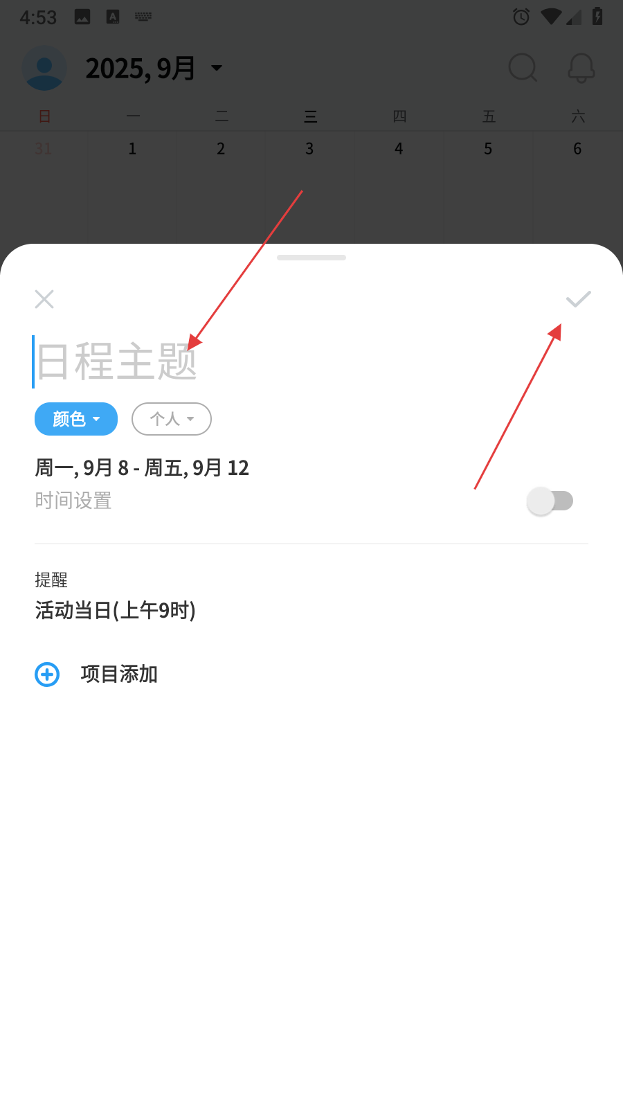 3、在日程编辑界面,填写日程主题,还可按需设置时间、提醒、添加项目等内容。