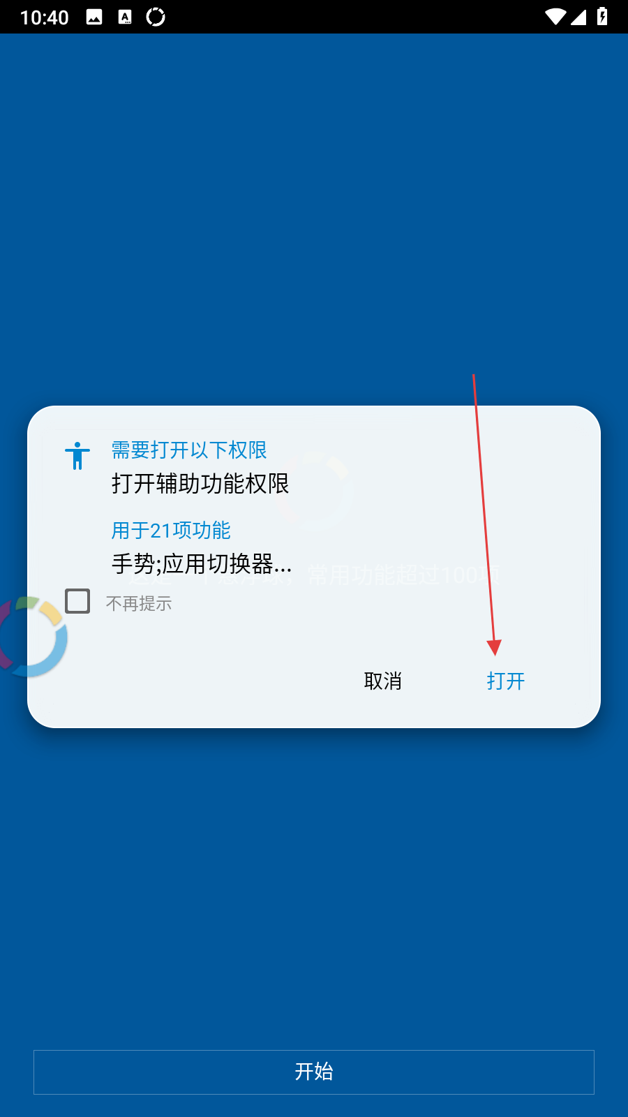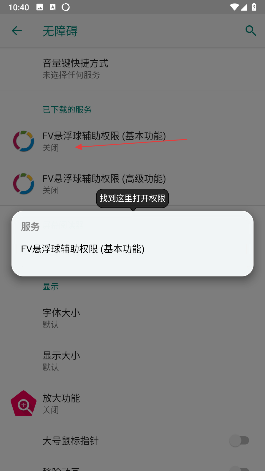 1、打开FV悬浮球,会弹出需要打开辅助功能权限的提示框,点击打开按钮,进入手机的无障碍设置页面。