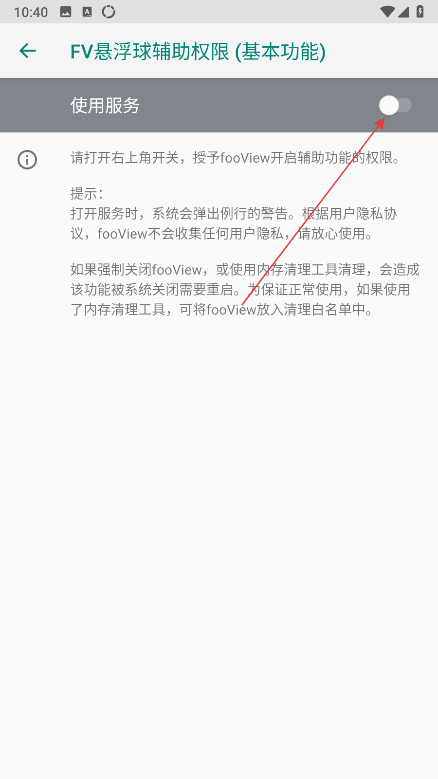 3、进入FV悬浮球辅助权限页面后,点击使用服务右侧的开关,将其开启。