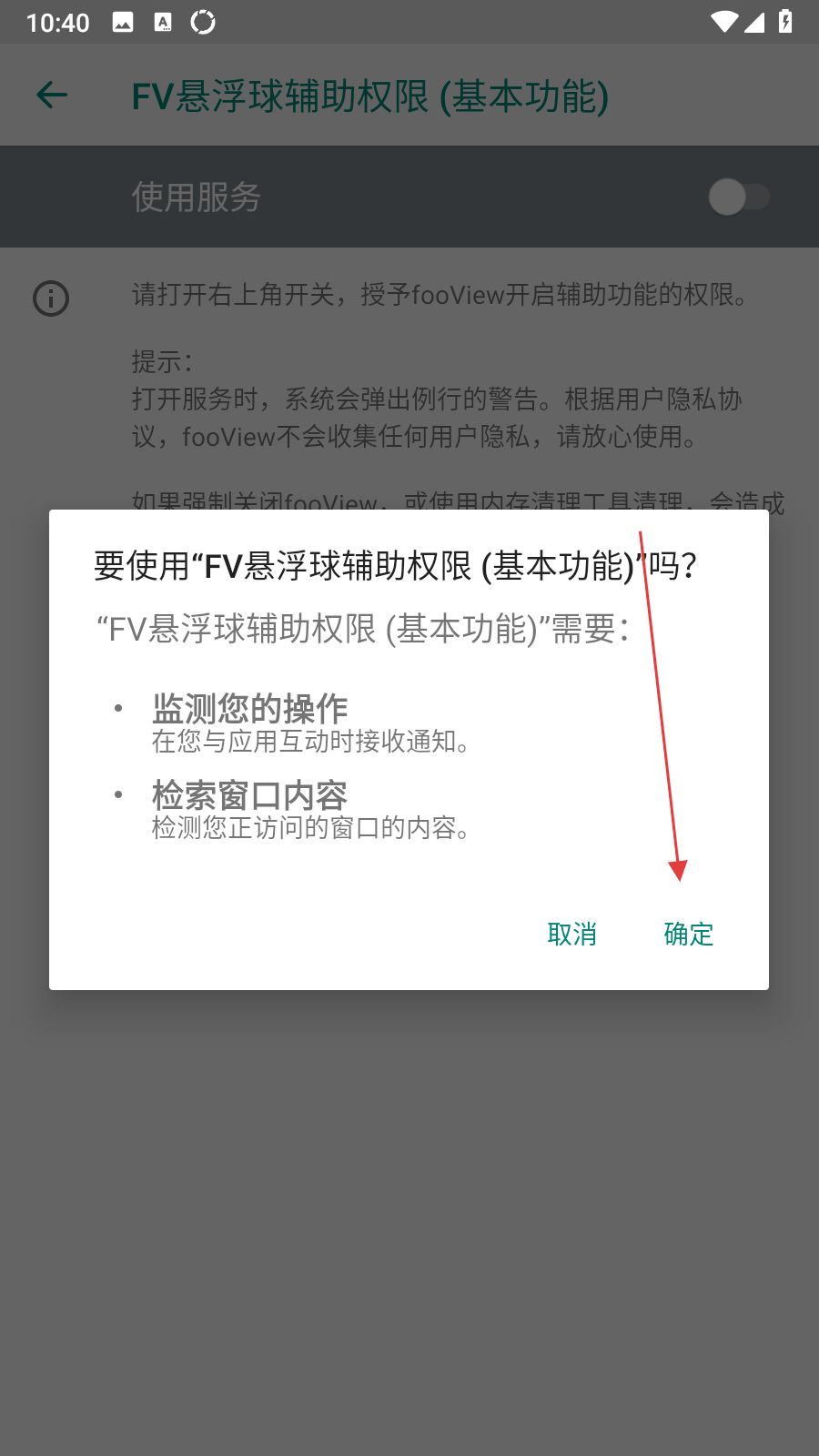 4、此时会弹出权限确认弹窗,提示要使用‘FV悬浮球辅助权限吗,点击确定按钮,完成辅助功能权限的打开操作。