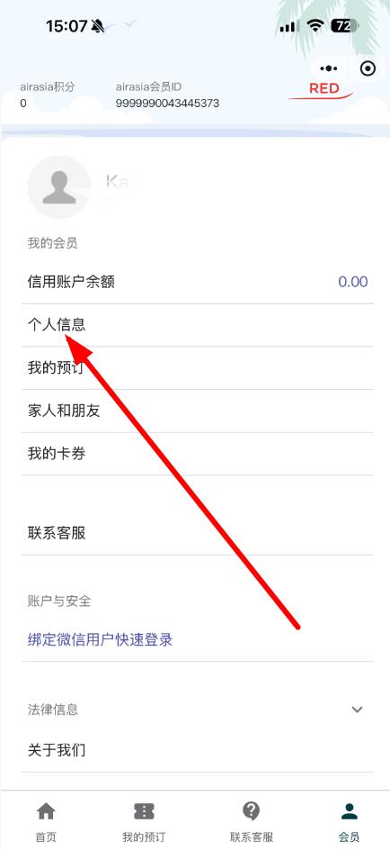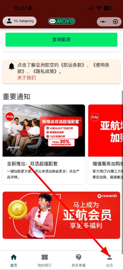 1、打开亚洲航空app,点击底部导航栏中的会员选项。