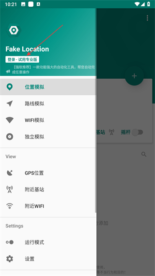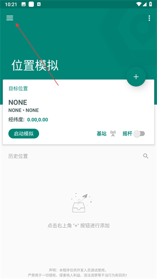 1、打开Fake Location应用,点击左上角三条横线图标,展开侧边菜单。
