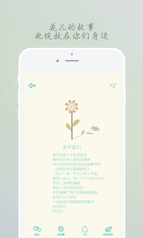 花儿是一款为了时间而生的有趣应用。在约会,和各种朋友们相聚的场合时,打开花儿,放下手机,就能开始播种,在山坡上慢慢长出的花儿,收获后可以分享给朋友。在这段时间里,请专注尽情的享受风趣的讨论和快乐的美食吧。