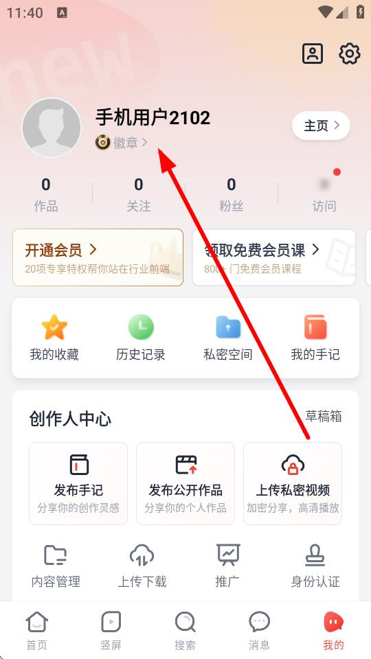 2、在个人页面中,点击显示为手机用户2102的用户名区域,进入个人主页。
