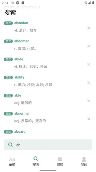 b、强大搜索,根据当前英文的首字母进行分类,可以快速搜索相关词汇;