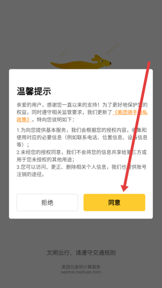 1、打开美团骑手app后,可以点击弹窗中的同意按钮,进入使用。