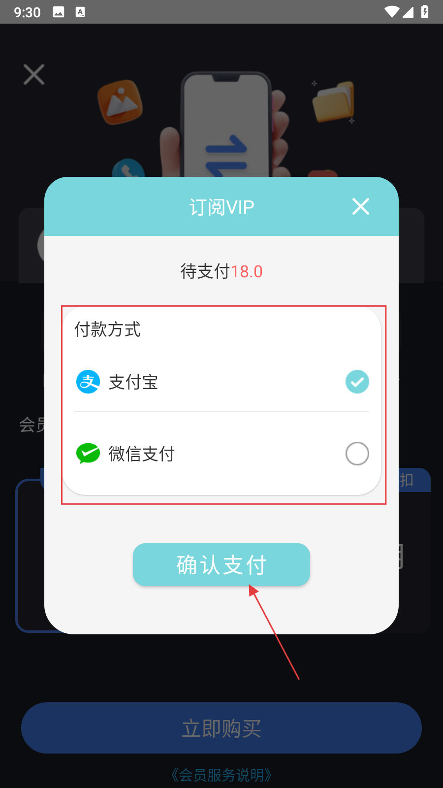 4、在支付方式选择页面,根据自身需求选择支付宝或微信支付,选择完成后点击确认支付按钮。