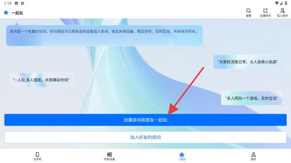 2、在一起玩的页面,点击创建房间和朋友一起玩蓝色按钮。