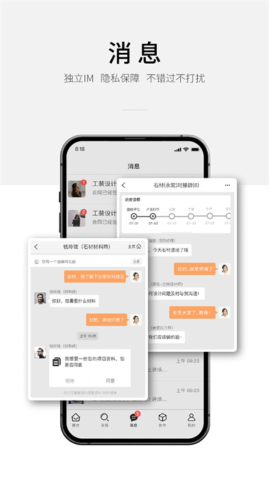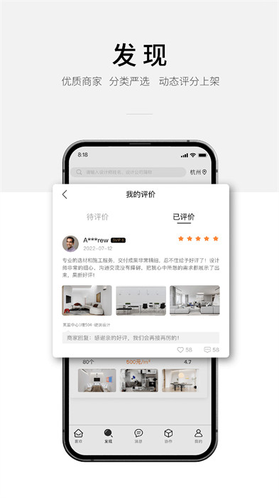 2、查看风格、看案例和找商家及时沟通,在线签约验收付款和装修档案等操作;