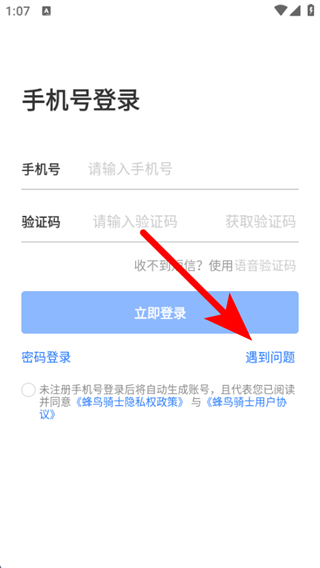 1、打开蜂鸟骑士APP,需要在手机号登录界面点击遇到问题。