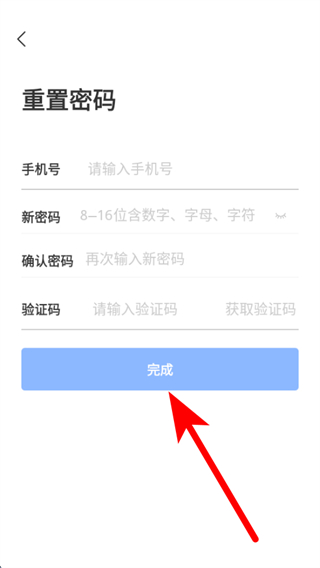 3、进入重置密码页面后,依次输入信息后点击完成,即可完成密码重置。
