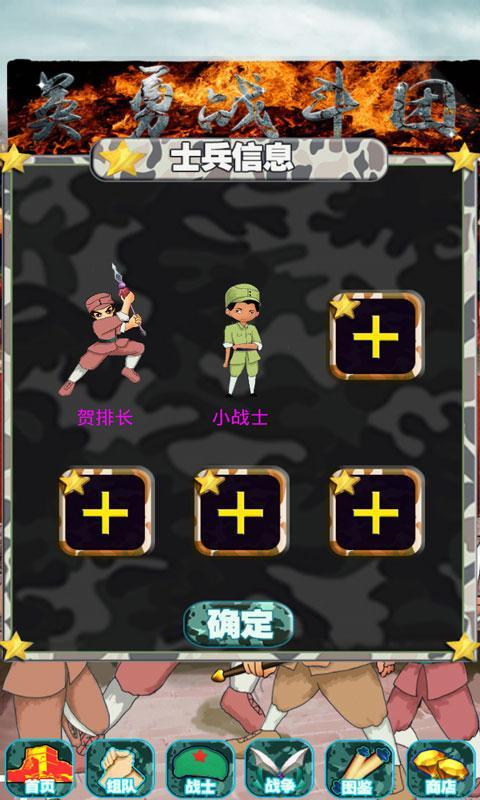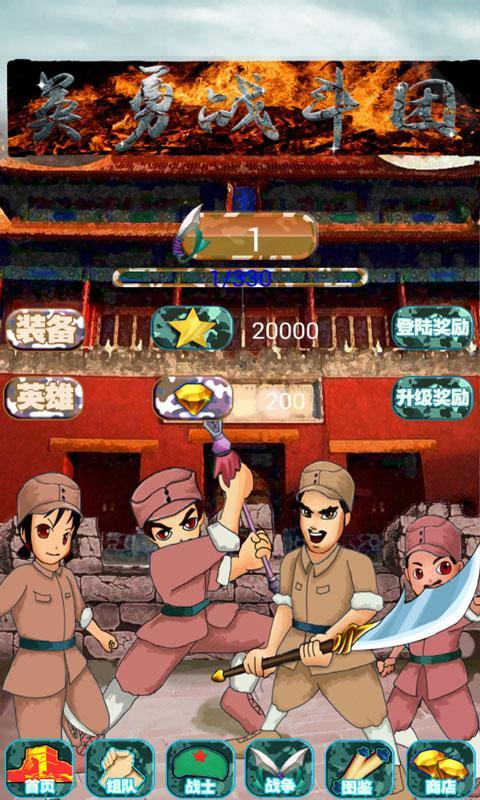 勇战斗团是一款卡通风格的点击类游戏,游戏中玩家点击游戏首页,查看装备、英雄,升级装备英雄获得更强技能;点击图鉴,查看战士技能,点击商店,获得钻石用于升级游戏装备和战士! 是一款以抗日战争时期的人物为角色的卡通风格的点击类游戏,游戏中玩家点击游戏首页,查看装备、英雄,升级装备英雄获得更强技能;通过养成卡牌来进行对战,以抗日为主要的题材,非常好玩,还有一些卡通的风格哦,让你体会独到的乐趣,快来试试吧。