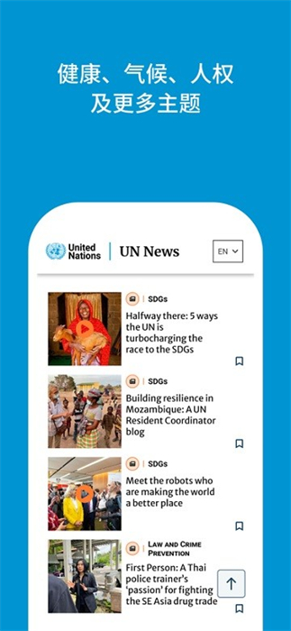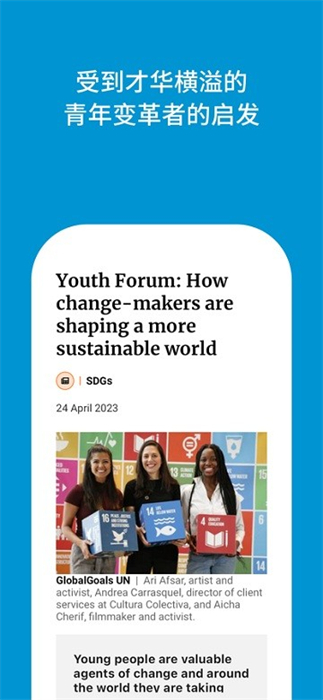 联合国新闻最新版是一款汇集了来自世界各地的热点新闻和深度报道,方便及时了解全球动态的手机阅读工具,通过它,我们可以深度了解各个国家之间的关系、全球的发展趋势,以及全球性议题的演变,无论身在何处,都可快速掌握最新的资讯,满足对全球动态的求知欲,同时软件的界面设计简洁明了,操作简单易上手,使得我们能通过浏览导航栏或者使用关键词搜索的方式,快速找到感兴趣的新闻内容,快来下载它,了解世界动态,拓宽知识视野。