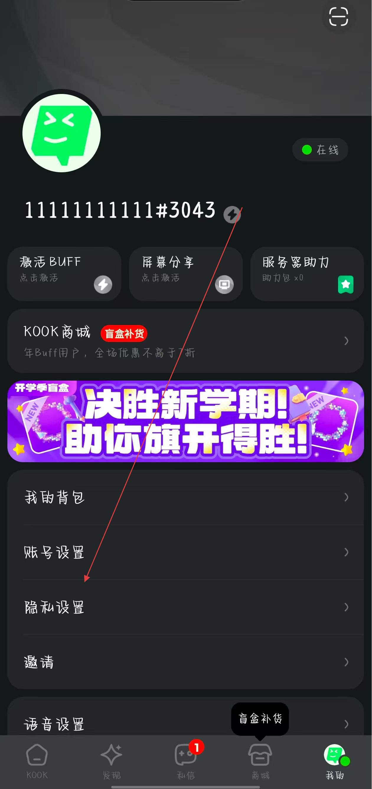 1、打开KOOKAPP,进入我的页面,点击隐私设置选项。