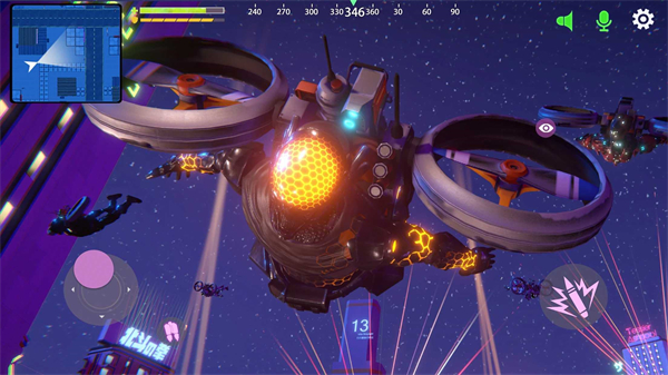 1、将可以通过屏幕左下方的虚拟控制按钮来控制机甲的移动和行走;