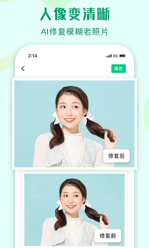 3、清晰人像:一件传图,自动将模糊的照片快速还原,进行快速修复;