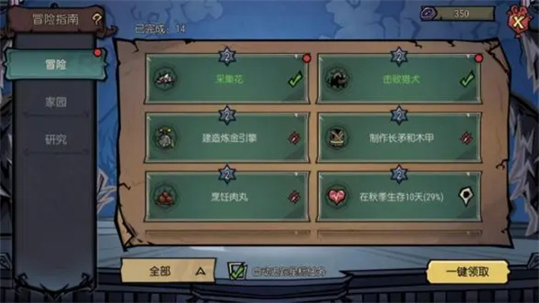 2. 二星任务:完成全部一星任务后解锁,共6个任务,其中击败猎犬、建造炼金引擎和沙盒秋季生存10天对于新手来说有一定挑战。猎犬会在冒险家生存的第6~13天之间随机一天发起袭击,冒险家可以提前制作好长矛和木甲,获取足够的战斗能力击败它们;如果想更快地找到猎犬,也可以在沙漠地区寻找猎犬丘,不过这样会比较危险。建造炼金引擎则需要金块作材料,建议冒险家提前采集好资源。如果在沙盒中没有遇到金矿,也可以回到家园在新解锁的岩石地区上挖矿。对于生存10天的任务,实际在已经做完一星生存3天任务后,只要再活过7天就可以完成。但要注意:幽灵状态是不记录生存时间的,因此需要冒险家继续保持良好状态,努力求生,也可以和其他玩家一起组队,互相帮助,生存难度会大大降低~