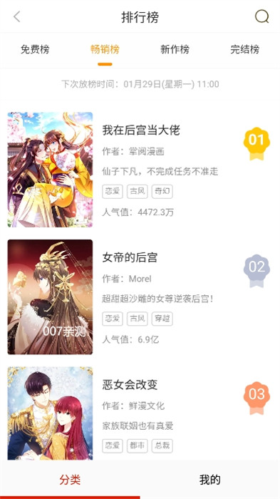 b、漫画排行榜,所有的高分漫画都能阅读并能不定期更新,带来更多的资源;