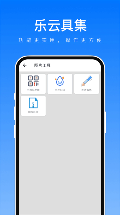 乐云具集手机版是一款集合了多种实用工具,为你提供了便捷的操作体验的应用程序,无论是需要生成二维码分享信息还是给图片添加水印保护版权,它都能帮我们快速完成,在这里准备了丰富的二维码样式和设置选项,方便你能根据需求灵活生成,同时,还可以用它来对图片的颜色进行调整,增添艺术效果,使得照片变得更加生动鲜明,不论是日常生活还是工作学习,它的出现都能满足你各种功能上的需求,快来下载体验吧。
