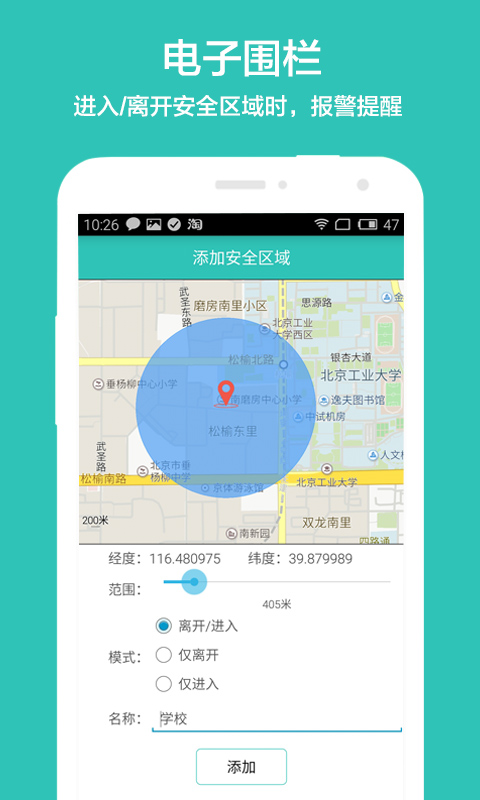 5.电子围栏:当设备离开/进入设定好的安全区域时,自动向主控号码发送短信提醒。