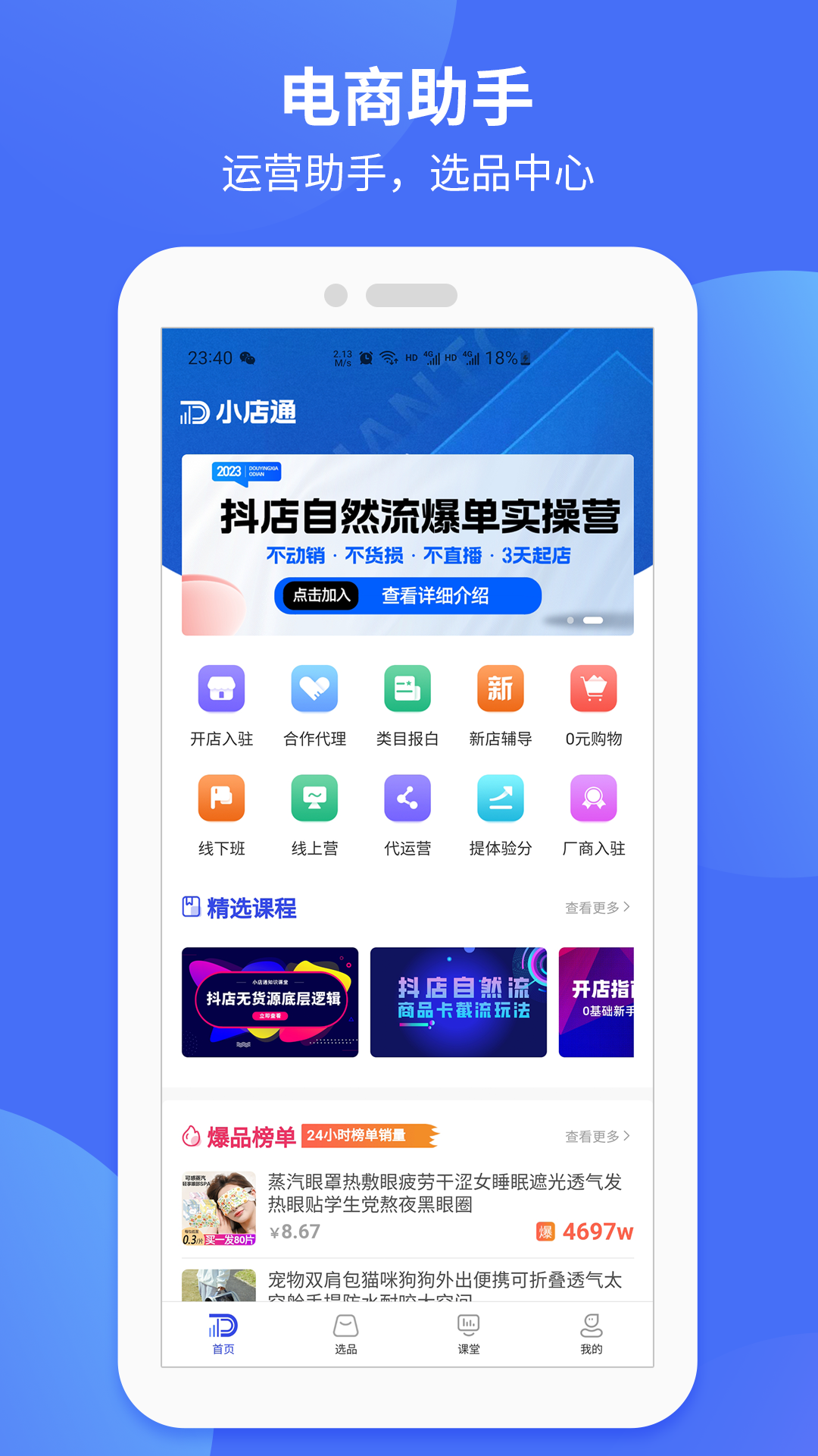 小店通app是一款抖店商家选品运营助手,主要提供一站式电商解决方案,非常适合做电商的用户使用,绝对是大家工作的好助手,帮助用户提高电商运营效率,并且软件有提供超多丰富的电商运用课程,用户可以在线选择适合自己的开始学习,掌握更多的专业知识。