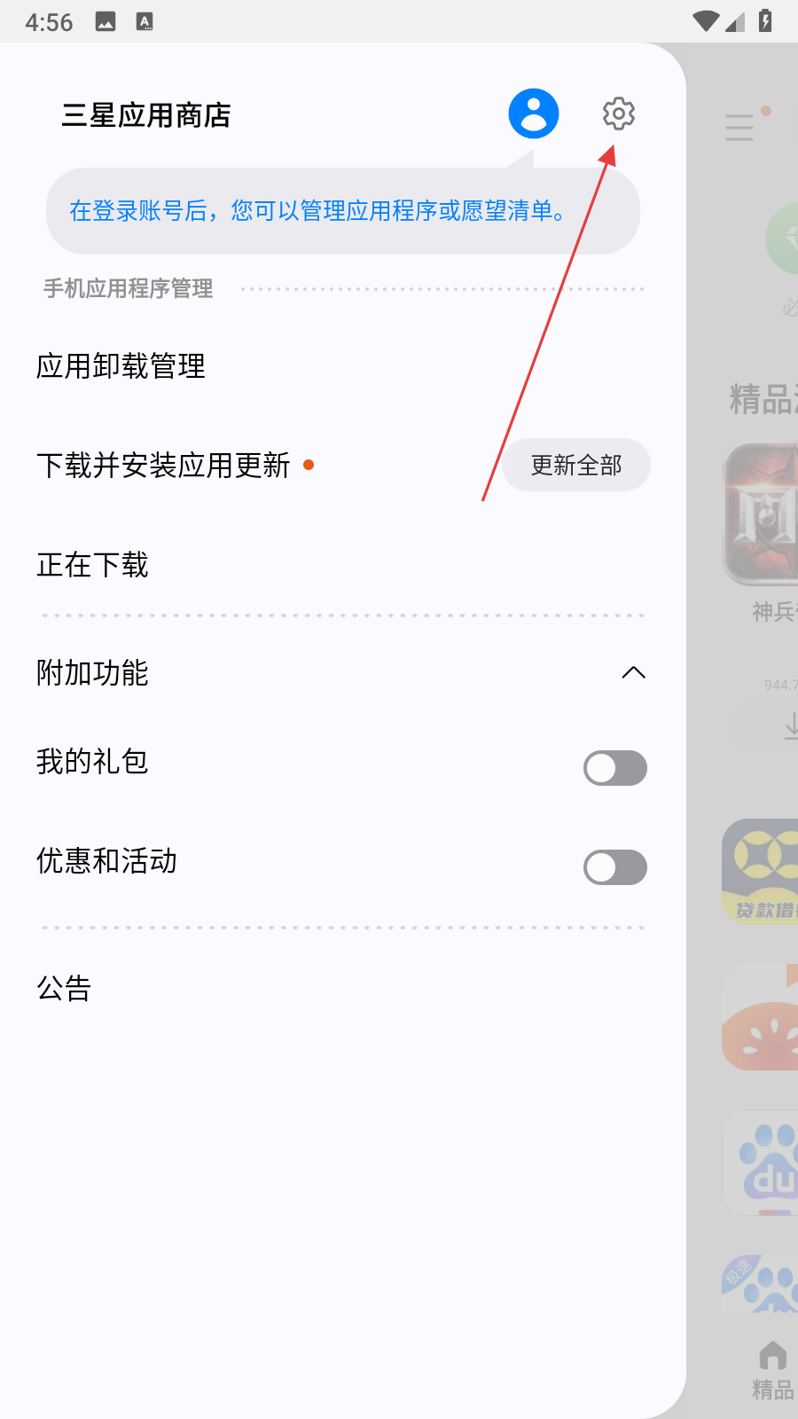 2、在弹出的侧边栏中,点击右上角的设置图标,进入三星应用商店设置页面。