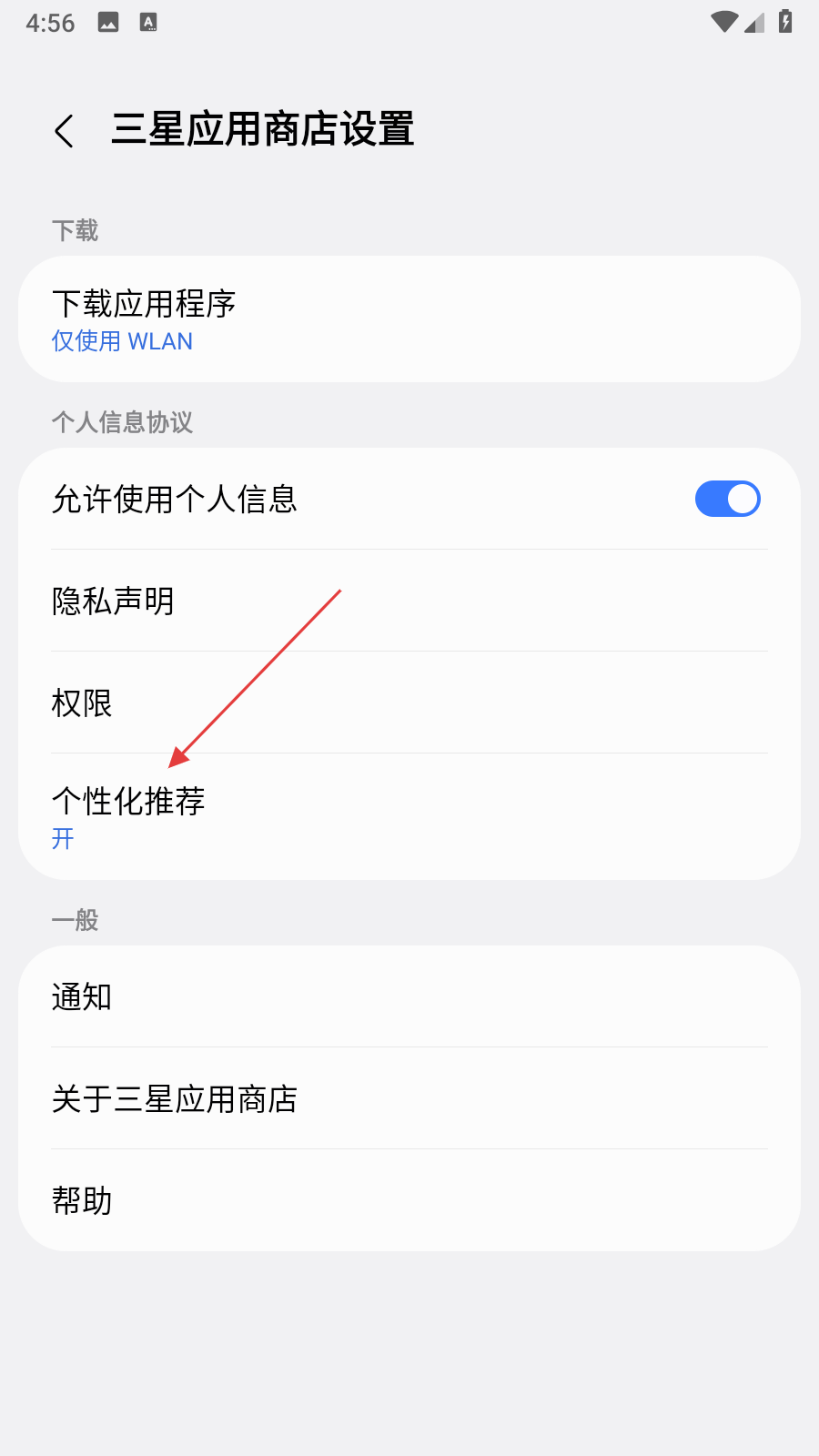 3、在设置页面中,找到并点击个性化推荐选项,进入个性化推荐设置页面。
