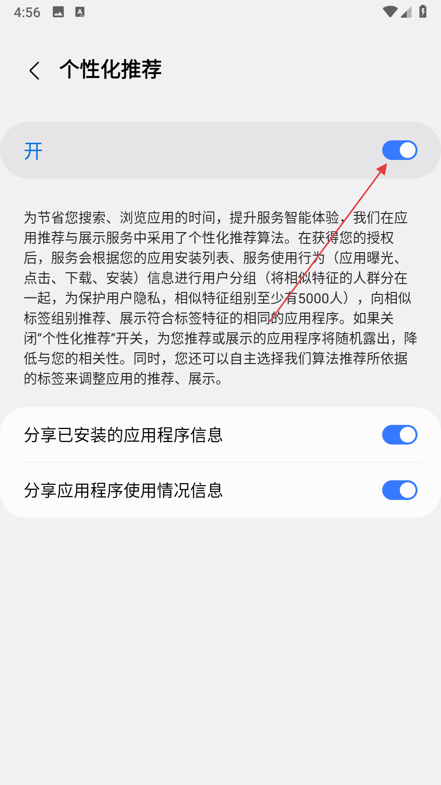 4、在个性化推荐页面,点击开对应的开关按钮,将其关闭。