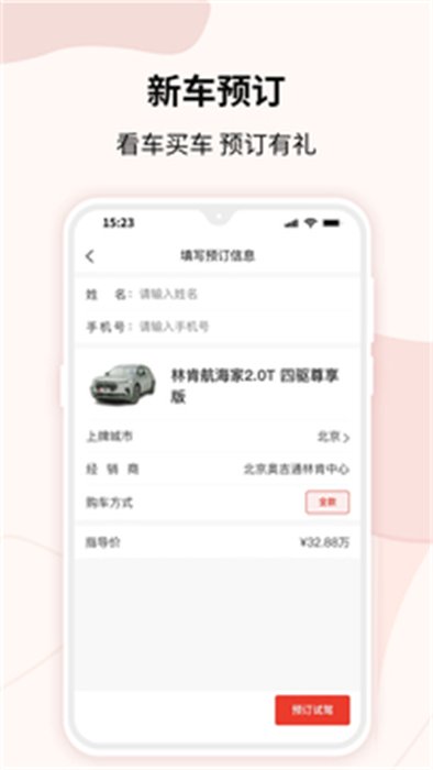 5、试驾预约:支持试驾预约,可在软件上预约试驾时间地点,体验车辆性能。