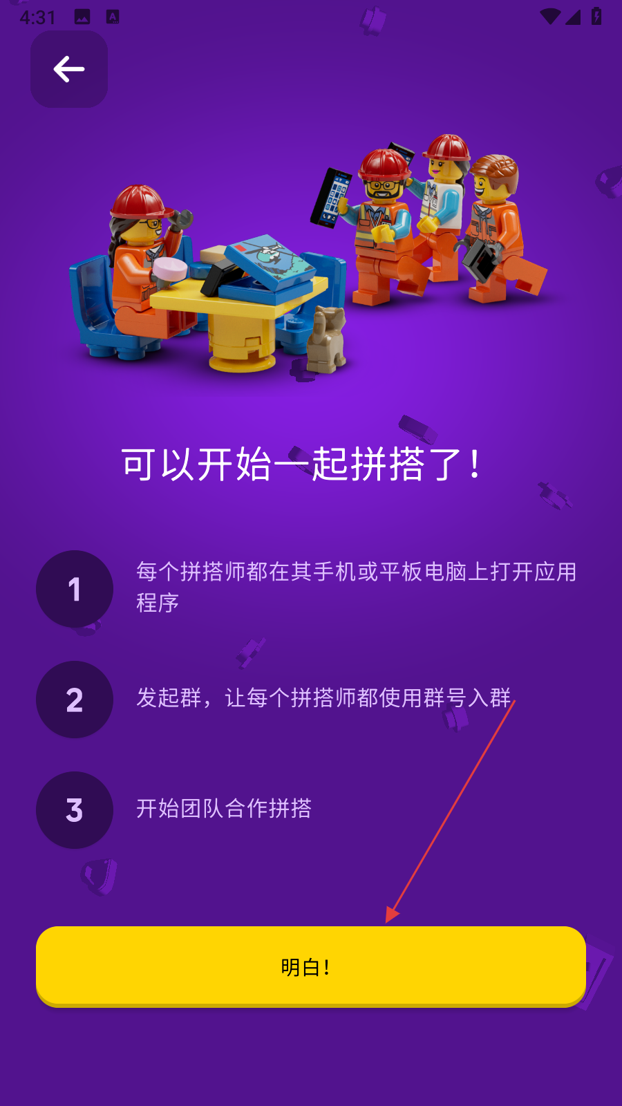 4、进入提示页面后,点击底部的明白按钮,进入群聊合作搭建即可。