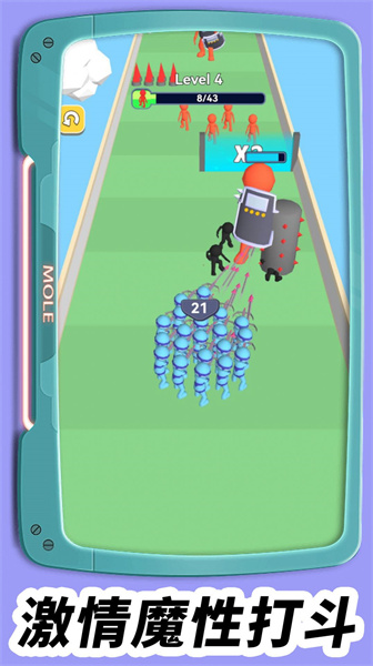游戏的关卡全部都是全新的设计,游玩起来可以得到最大的享受,需要我们不断的锻炼自己的走位,一旦进入到机关和陷阱,是会损失大量的人数,让自己的攻击力大幅度下降,是无法支持我们到达终点,导致游戏的失败,可以使用道具来帮助我们解决攻击力的难题,击败全部的敌人,完成自己的任务,刷新自己的记录,成为最后的赢家。