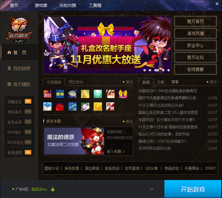 助手首页为您提供DNF最新的资讯、活动信息和便捷的功能入口。通过首页,您可以快速了解到DNF的最新动态。