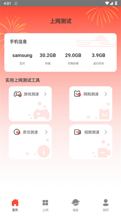 福星上网是一款十分好用的生活服务类软件,是一个专门为了用户进行管理网络的软件,为用户提供了许许多多丰富的管理功能,让用户可以随时满足自己的管理需求,软件帮助用户们在线一键测试自己上网的速度,各项信息都有详细的展示,方便用户们查看和了解自己的网络情况,满足上网需求。