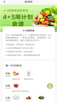 ②、瘦身食谱,如营养、脂肪、维生素等等摄入都有严格的搭配,轻松进行减脂;