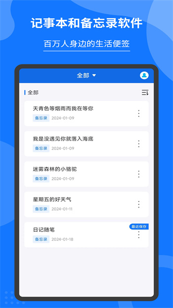 轻松记事本备忘录app是一款十分好用的生活服务类软件,是一个专门为了用户进行记录事情的软件,为用户提供了许许多多丰富的记录功能,让用户可以随时满足自己的记录需求,功能十分强大的记事本助手,软件支持笔记的记录、写日记和备忘录等多种模式,让用户们轻松的在线记录。