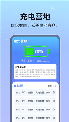 电充营地app是一款专门给安卓设备打造的充电辅助工具,日常充电的次数以及时间都会自动存储,并且完全不会出现对电池的损害,不定期带来各种正确操作的教程,以便让大家能够感受到电池健康的变化,不仅如此,设备还能随时清理一些缓存,以便保障设备长期的运行流畅,每天大家使用的网络都会生成流量统计,并且有无线网络和移动网络的区分,轻松就能让用户了解的更加直观,日常想要维护设备的用户快来下载吧!