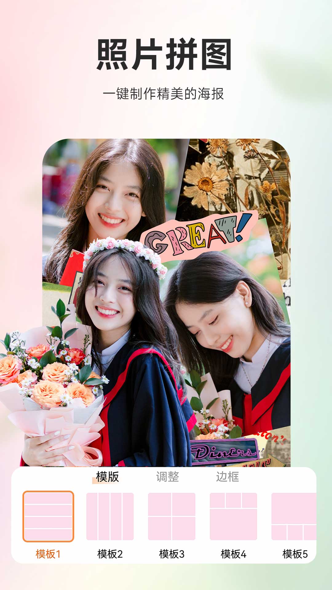 a、拼图模版,软件内的这些模版素材会不断更新,轻松将多张照片组合;