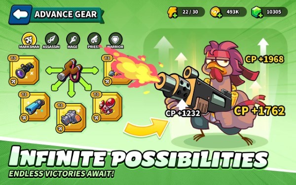 1、作战中有超过三十多个不同鸡角色,通过升级搭配获得更强大的战斗力量;