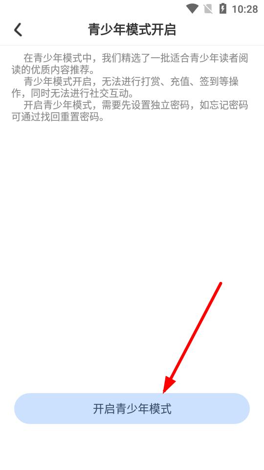 4、在青少年模式设置页面,点击开启青少年模式按钮,按提示设置独立密码后即可成功开。