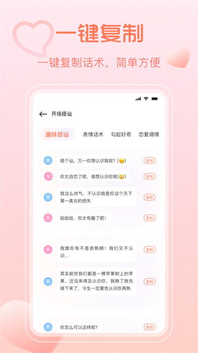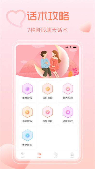 2、在软件里面涵盖了恋爱谈话当中的各种各样的场景,包括表白和聊天等;