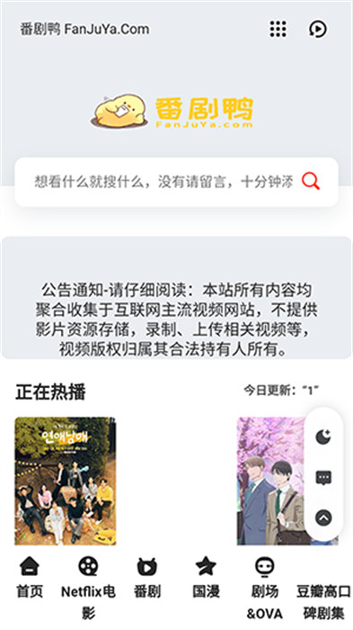 番剧鸭是一款十分好用的动漫漫画类软件,是一个专门为了用户进行观看动漫的软件,为用户提供了许许多多丰富的动漫类型,让用户可以随时满足自己的观看需求,可以方便追番看动漫的追番神器,软件里面提供了非常多丰富的动漫资源可以免费搜索,没有任何的广告也不需要注册登录。