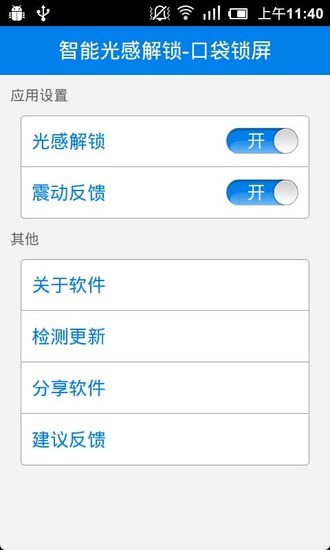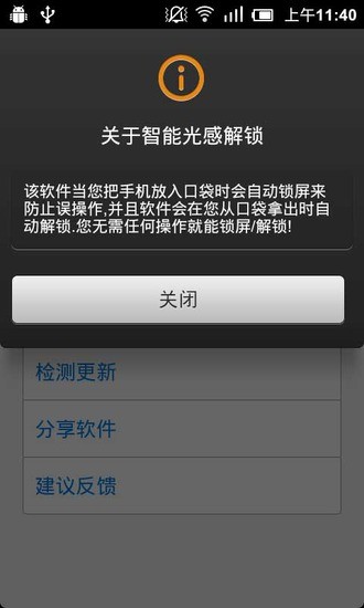 智能光感解锁是一款特别神奇的自动解锁屏软件,当你把手机放进口袋里,手机就会自动锁屏,当你拿出手机时,手机会自动点亮屏幕,这样您就不用担心自己手机在口袋里会误打电话的尴尬了。